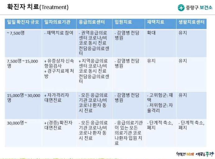 응급의료도 기존 권역응급의료센터와 함께 지역응급의료센터도 코로나19 환자와 비(非)환자 동시 진료를 맡아야 한다. 감염병 전담병원이 입원치료를 맡고, 재택치료 및 생활치료센터 운영은 유지될 수 있다.