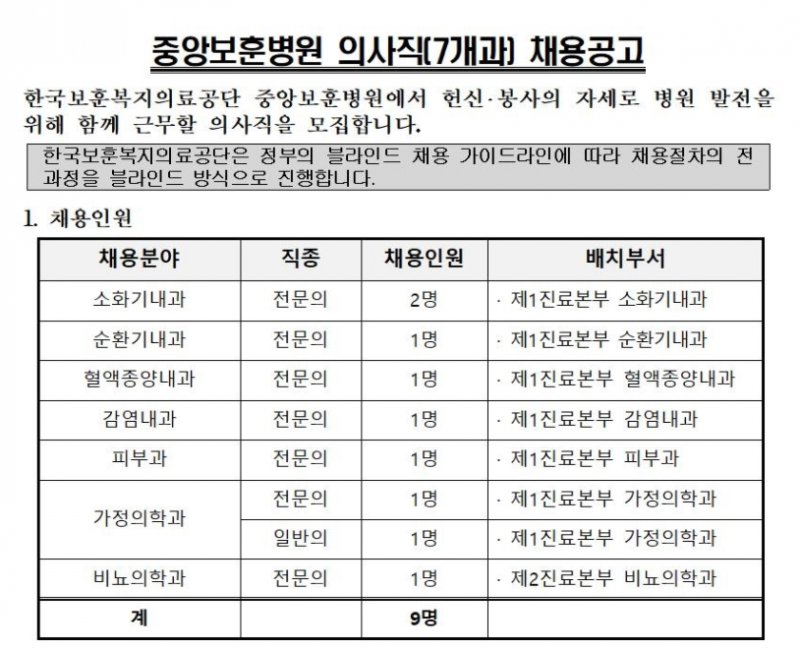 이어 이달 21일에도 혈액종양내과·감염내과·소화기내과·순환기내과·피부과·가정의학과(일반의, 전문의 각 1명)·비뇨의학과 등 7개 진료과 전문의 등 총 9명 채용 공고를 올렸다.