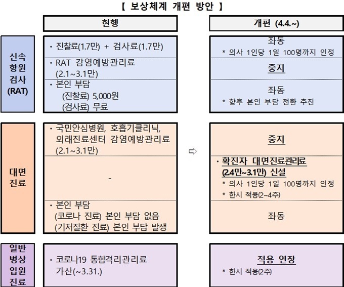 또 동네 병·의원의 RAT에 추가 보상하던 감염예방관리료는 오는 4일부터 폐지된다. 병·의원이 검사와 대면진료를 함께 실시토록 유도하고, 여기에 보상한다는 복안이다.