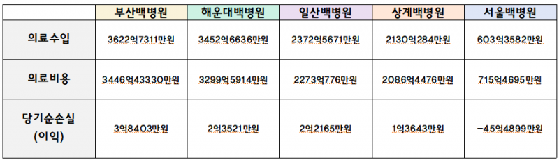이어 서울백병원은 5개 산하 병원은 ‘나홀로 적자’를 기록했다. 서울백병원은 해당 기간 603억3582만원의 의료수입을 거둔 한편, 의료비용은 이를 상회하는 715억4695만원을 지출했다.