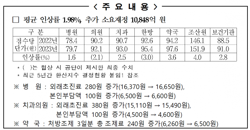 2023년도 수가는 평균 1.98% 인상된다. 병원 1.6%, 치과 2.5%, 약국 3.6%다. 이에 따른 추가 소요재정은 1조848억이다. 반면 의원과 한방은 협상이 결렬됐다.