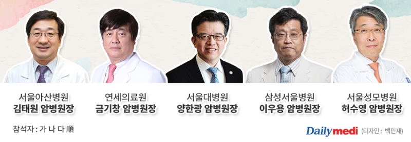 좌담회에는 김태원 서울아산병원 암병원장, 금기창 연세의료원 암병원장, 양한광 서울대병원 암병원장, 이우용 삼성서울병원 암병원장, 허수영 서울성모병원 암병원장(이름 가나다 順)이 참석한다.