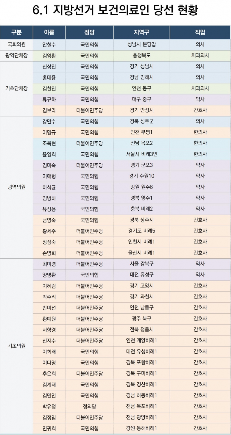 지난 6월 1일 치러진 전국동시지방선거 및 국회의원 재·보궐선거 개표결과 보건의료인의 약진이 두드러졌다. 의사와 간호사, 한의사, 치과의사, 약사 등 보건의료 직역은 당선인을 여럿 배출하며 정치적 입지를 다졌다. 우선, 대선후보 중도 사퇴 이후 정치 인생에 빨간불이 들어왔던 의사출신 안철수 국민의힘 후보는 경기 성남시 분당구갑 재·보궐선거를 통해 원내 진입에 성공했다. 대한의사협회 회장 및 4선 국회의원이었던 신상진 국민의힘 후보 또한 경기 성남시장으로 당선됐다. 대선후보 골리앗 이재명 후보와 어깨를 나란히 하며 초박빙 승부를 보였던 윤형선 후보는 10%p 격차로 아쉽게 낙선했다. 간호계에서는 김보라 더불어민주당 후보가 경기도 최초 여성 재선시장에 당선되는 등 19명의 당선자를 배출했다. 이번 지방선거에서 당선된 보건의약인은 총 36명으로 의사 4명, 간호사 19명, 한의사 3명, 치과의사 2명, 약사 8명 등이다. 예상보다 많은 보건의료인 강세로 의료계 기대감이 한껏 부풀어 오르는 가운데 각 직역별 당선 현황을 알아봤다.