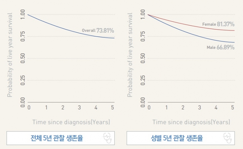 삼성암병원에서 치료받은 전체 암 환자의 5년 관찰 생존율은 73.81%이며, 남성 66.89%, 여성 81.37%로 세계 최고 수준에 와 있다.