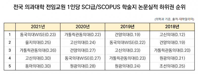 데일리메디가 국가기관 사이트 대학알리미에 공시된 최근 4개년 대학정보공시 자료를 토대로 전국 의과대학 전임교원 1인당 SCI(과학기술논문인용색인)급 혹은 SCOPUS 학술지 논문 실적을 분석한 결과, 이들 의과대학은 4년 내내 하위권을 벗어나지 못했다.