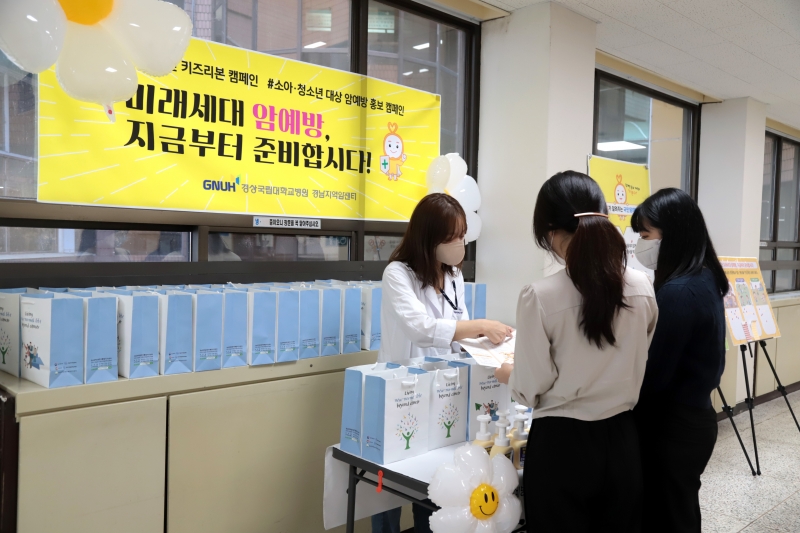 경상국립대학교병원(병원장 윤철호) 경남지역암센터(소장 이옥재)가 6일 병원 본관 1층 소아청소년과외래 앞 홍보부스에서 ‘키즈리본 캠페인’을 개최했다.