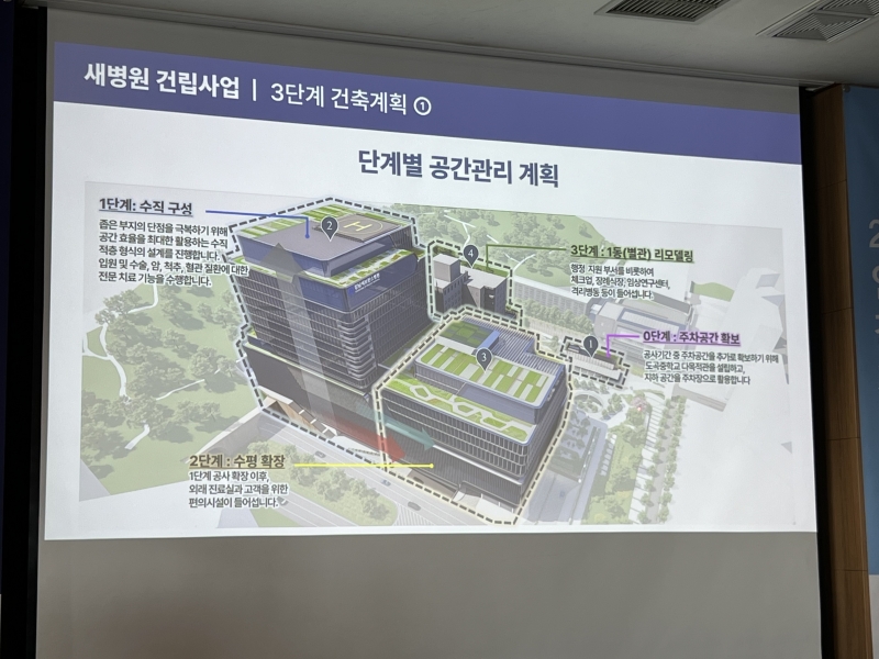 새병원 건립 계획을 세부적으로 살펴보면 ▲주차공간 확보(0단계) ▲수직 집중형 건물 건축(1단계) ▲수평 건물 확장(2단계) ▲1동 리모델링(3단계) 순으로 진행된다.