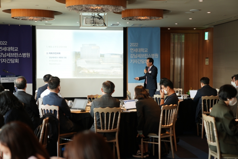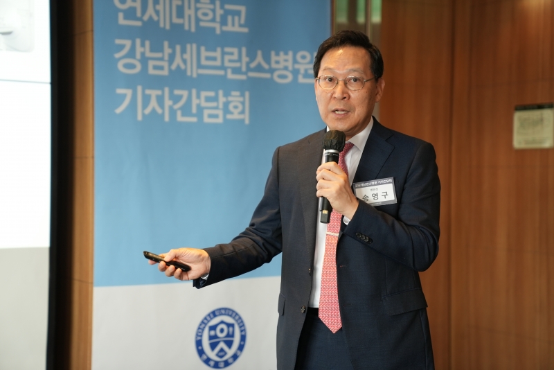 송영구 강남세브란스병원장은 12일 서울 코엑스 인근에서 열린 기자간담회에서 오는 2030년 완공을 목표로 하는 새병원 사업 계획안을 발표했다.