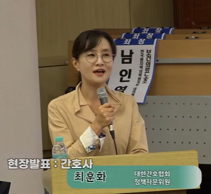 남인영 간호조무사(보건노조 한국원자력의학원지부 대의원) 환자 당 간호조무사 인력 기준은 1대 20 이하로 해야 한다. 간호간병통합병동을 제외한 병원급 의료기관에서는 간호조무사 정원을 인정받지 못해 무자격자와 동일한 취급을 받고 있다.