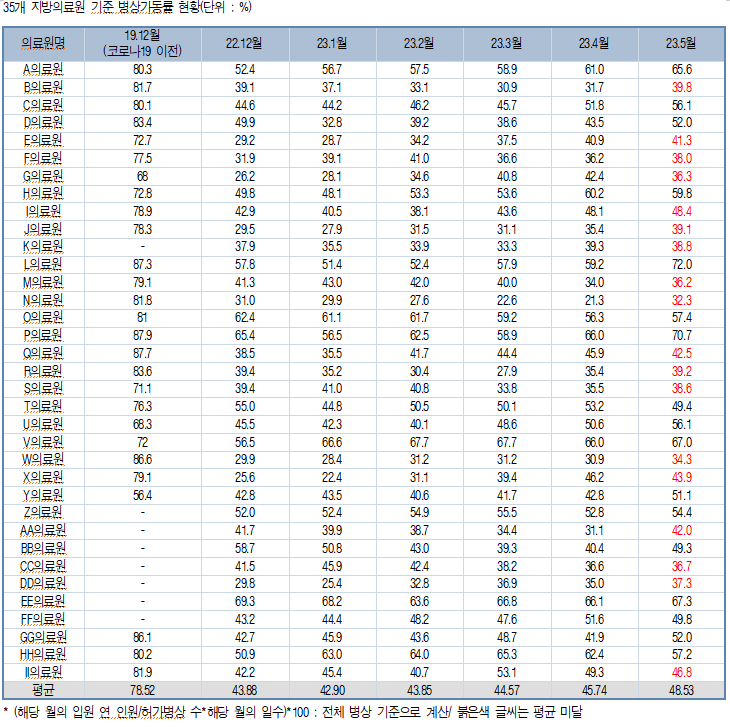 지방의료원만 놓고 봐도 상황은 심각하다. 속초의료원(32.3%), 군산의료원(34.3%) 등을 포함한 12곳은 30%대이며 9곳은 40%대 수준이다.