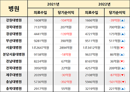 흑자 기록에는 성공했지만 2021년보다 경영 성과가 악화된 병원들도 있다.