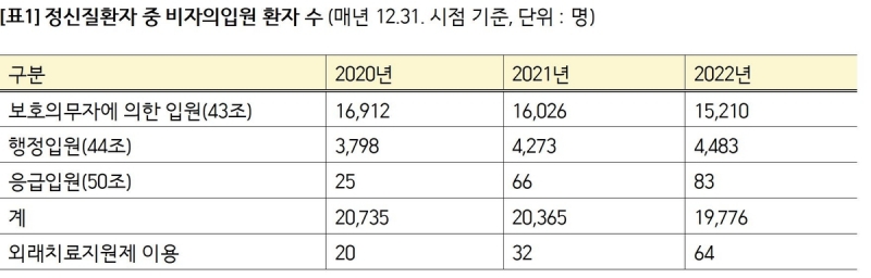 정춘숙 의원실 자료에 따르면, 정신질환자 중 비(非)자의 입원 환자 수는 2020년 2만735명, 2021년 2만365명, 2022년 1만9776명으로 3년간 약 2만명 수준을 유지하고 있었다.