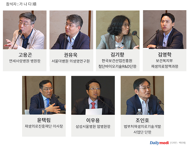 [기획 上] '첨단 재생의료'란 사람 신체 구조 또는 기능을 재생, 회복, 형성해 질병을 치료하거나 예방하기 위해 세포 등을 이용해 실시하는 세포 치료, 유전자 치료, 조직공학 치료 등을 말한다. 이는 희귀·난치 질환자 치료 기회를 확대할 수 있어 미래 의료기술 초석으로 평가받고 있다. 정부도 지난 2020년부터 '첨단 재생의료 지원에 관한 법률'을 시행하며 산업 육성에 물꼬를 텄지만 정작 국내에서는 규제로 인해 활성화에 어려움을 겪고 있다. 이에 데일리메디는 특별기획으로 '재생의료 활성화 방안 모색을 위한 전문가 정책 좌담회'를 개최하고 국내 재생의료 현주소를 진단하고 향후 나아가야 할 방향을 모색했다. 이번 좌담회에는 ▲삼성서울병원 이우용 암병원장(좌장) ▲재생의료진흥재단 윤택림 이사장 ▲범부처재생의료기술개발사업단 조인호 단장 ▲연세사랑병원 고용곤 병원장 ▲서울대병원 의생명연구원 권유욱 교수가 패널로 참여했다. 아울러 재생의료 정책 실무 책임자인 ▲보건복지부 김영학 재생의료정책과장 ▲한국보건산업진흥원 김기향 첨단바이오기술R&D단장이 정부 정책을 기반으로 재생의료 활성화 방안을 제시했다. [편집자주]