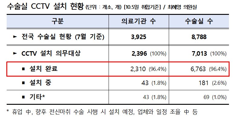 9일 국회 보건복지위원회 최혜영 의원(더불어민주당)이 보건복지부로부터 제출받은 자료에 따르면 10월 5일 취합기준 전국 수술실 CCTV 의무 의료기관 2396개소 중 2310개소(96.4%)가 설치를 완료했다.