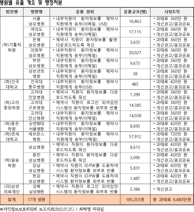실제 개인정보위 조사 결과, 2018년 4월부터 2020년 1월까지 17개 대형병원에서 내부 직원 또는 외부자인 제약사 직원을 통해 총 18만5271명의 환자정보가 유출된 것으로 드러났다.