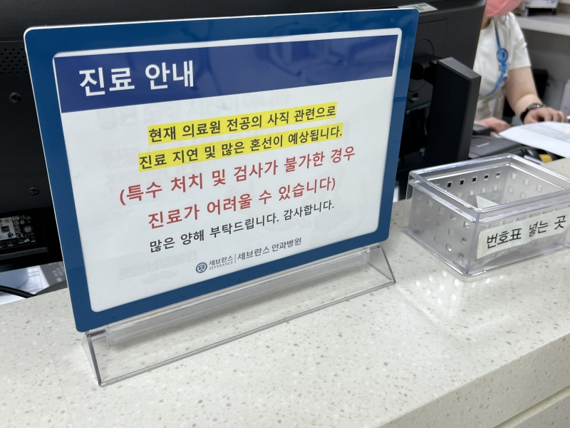 실제 안과 접수 데스크에는 ‘현재 전공의 사직 관련으로 진료 지연 및 많은 혼선이 예상된다’는 문구가 적힌 팻말이 놓여 있다.