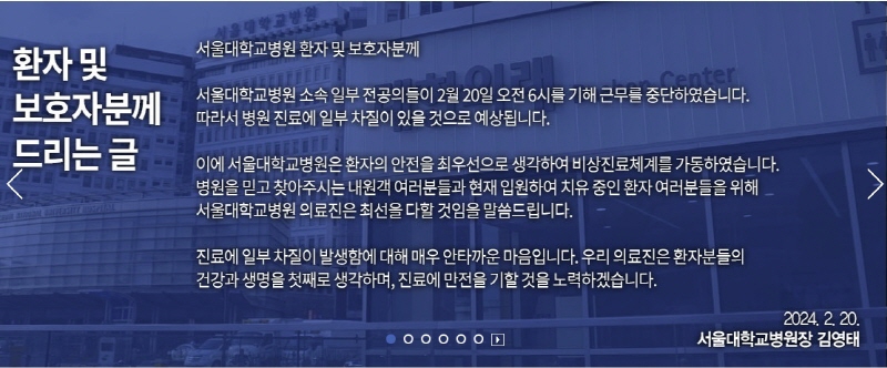 김영태 서울대병원 병원장은 지난 20일 홈페이지에 ‘환자 및 보호자분께 드리는 글’을 게시하고 “진료에 일부 차질이 발생함에 대해 매우 안타까운 마음”이라며 “우리 의료진은 환자분들의 건강과 생명을 첫째로 생각하며, 진료에 만전을 기할 것을 노력하겠다”고 말했다.