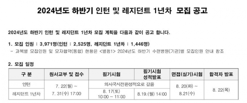 한편, 인턴의 경우 별도 필기시험 없이 오는 8월 20~21일 이틀간 면접을 진행한다. 레지던트 1년차는 8월 17일 필기시험, 20~21일 면접이다. 합격자는 8월 22일 동시에 발표된다.