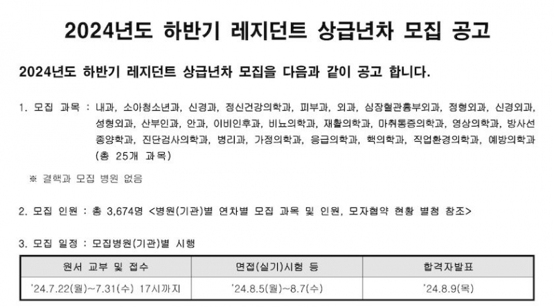 레지던트 상급년차는 8월 5일부터 7일까지 3일 동안 면접이 진행된다. 합격자 발표는 8월 9일이다.