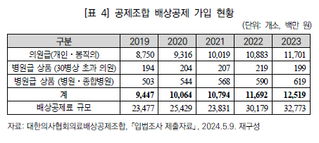 실제 대한의사협회 의료배상공제조합이 입법조사처에 제출한 자료에 따르면 작년 기준 공제조합에 가입한 의료기관 수는 1만2519개소로 전체 병의원 수(3만7137개소)의 33.7%에 그치고 있다.