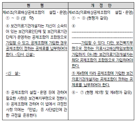 해당 개정안은 보건의료기관 개설자의 의료배상공제조합 가입을 의무화해 의료사고로 인한 민형사상 소송에 따른 사회적 비용을 경감하는 게 목적이다.