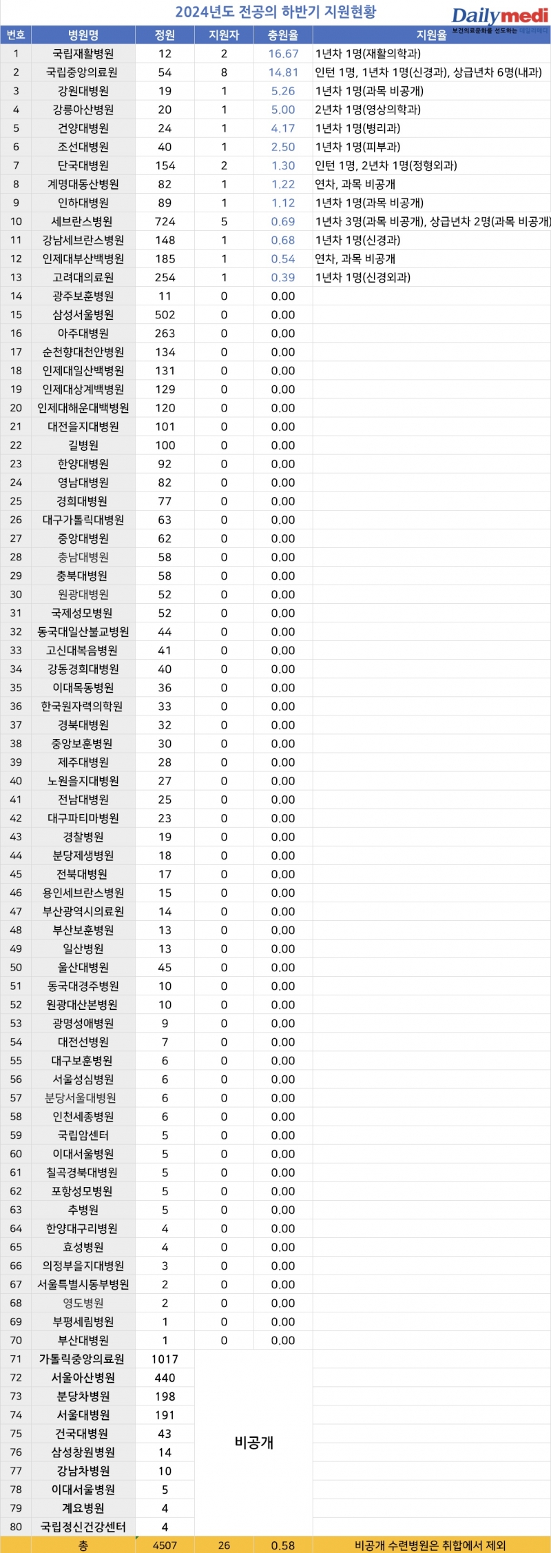 7월 31일 데일리메디가 전공의 하반기 모집에 나선 수련병원 80곳을 조사한 결과, 비공개 방침을 밝힌 11곳을 제외한 69곳 평균 충원율은 0.58%였다.