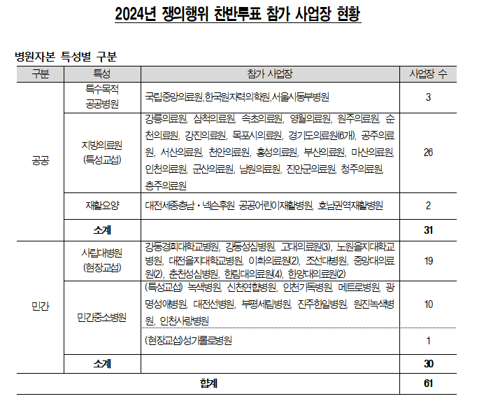 24일 보건의료노조에 따르면 이는 지난 19일부터 23일까지 쟁의행위 찬반투표를 진행한 결과로, 61개 사업장 조합원 총 2만9705명 중 2만4257명(81.66%)이 참가했다.