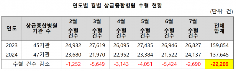 2023년 대비 2024년 2월부터 7월까지 전국 상금종합병원 전혈 및 혈액성분제제 사용 환자 수는 2만958명이 감소했지만, 종합병원은 4755명이 증가했다. 2024년 2월부터 7월까지 1만6203명의 환자가 수술과 치료를 못 받았을 가능성이 높다.
