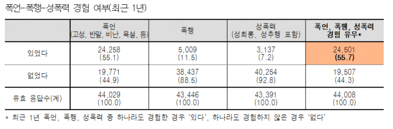 성별에 따른 폭언·폭행·성폭력 경험 여부를 분류해보면, 여성의 경우 폭언·폭행·성폭력 경험률은 각각 59.8%, 12.7%, 8.4%로, 폭언과 폭행은 남성의 약 2배, 성폭력은 약 3배가량 높았다.