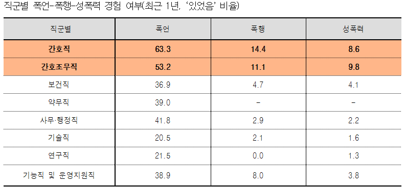 특히 대면 업무를 수행하는 여성 집중 직군인 간호직과 간호조무직의 피해 경험률이 높았다. 폭언·폭행·성폭력 경험률 합은 각각 86.3%, 74.1%로 나타났다.