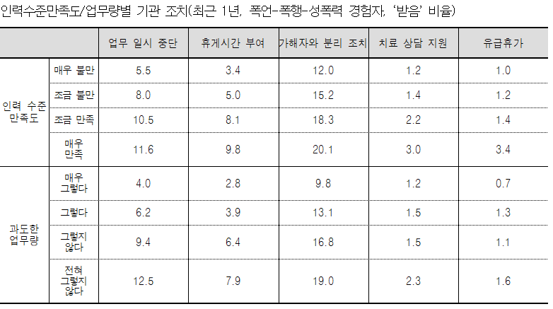 이 같은 의료기관 내부의 보호조치는 인력 수준과 업무량에 따라 차이가 존재한다는 게 노조 분석이다. 실제 인력 수준에 만족할 수록, 업무량이 많지 않을 수록 조치를 받는 비중이 증가했다.