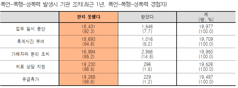 병원 차원의 조치를 받았다는 경우도 극히 드물었다. 피해 발생 시 업무 일시 중단, 휴게시간 부여, 가해자 분리, 치료·상담 지원, 유급휴가 제공 등 보호조치 실시 여부를 물었더니 대부분 이를 제공받지 못했다(92.3%~98.9%).