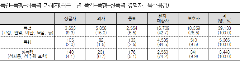 실제 조사 결과 폭언·폭행·성폭력 가해자로는 상급자, 의사, 동료, 환자, 보호자 등이 지목됐는데 폭언의 경우 환자 42.7%, 보호자 26.5%, 의사 15%, 상급자 9.3% 순으로 높았다.