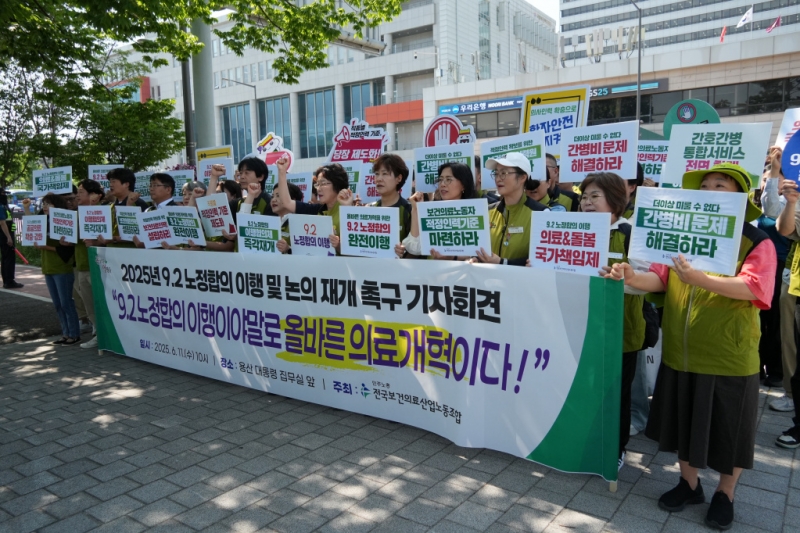 보건의료노조는 지난 11일 용산 대통령실 앞에서 기자회견을 열고, 문재인 정부 시절 보건복지부와 체결한 9·2 노정합의와 21대 대선 전 더불어민주당과 체결한 정책협약을 촉구했다.