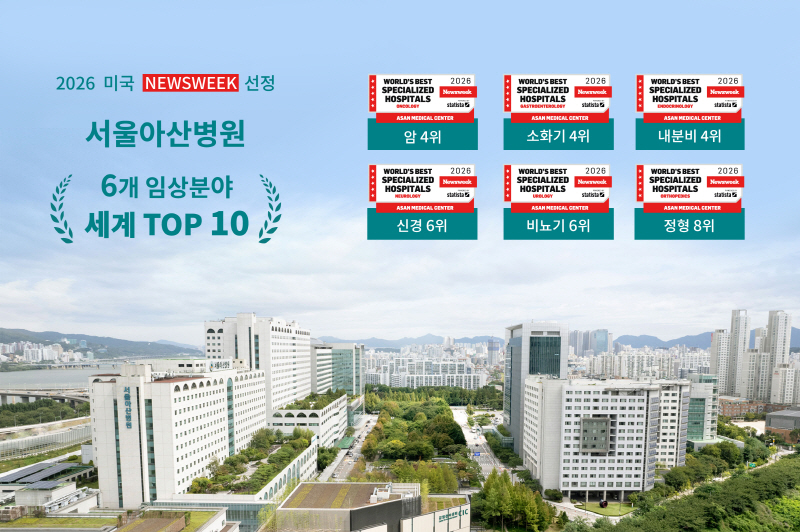 아산사회복지재단(이사장 정몽준) 서울아산병원이 미국 뉴스위크지가 시행한 ‘2026년도 12개 임상분야별 세계 최고 병원’ 평가에서 6개 분야가 세계 10위 안에 들었다고 11일 밝혔다. 국내 병원 가운데 가장 많은 임상분야가 세계 10위 이내에 진입했다.
