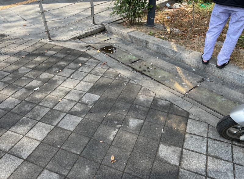 환자들이 오가는 병원 입구 바로 앞에서 흡연자들이 버젓이 담배를 피우고 있고 바닥은 담배꽁초가 어지럽게 흩어져 있다. 흡연금지 표지판이 곳곳에 붙어 있지만 무용지물이었다.
