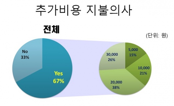 추가로 부담할 수 있는 금액은 '1만원 이상~2만원 미만'이 38%로 가장 많았으며 '2만원 이상~3만원 미만'은 26%, '5천원 이상~1만원 이하'는 21%, '5천원 미만'은 15%로 조사됐다.