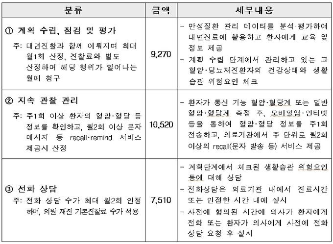 항목별 수가를 살펴보면 △계획 수립 및 점검·평가 → 9270원 △지속 관찰 관리 → 1만520원 △전화상담 → 7510원 등이다.