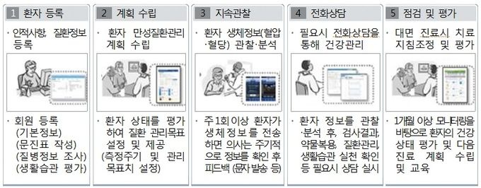 시범사업에서는 의사가 대면진료시 환자별 관리계획을 수립하고, 주 1회 이상 주기적으로 혈압 및 혈당정보를 관찰, 월 2회 이내로 전화상담을 실시하게 된다.