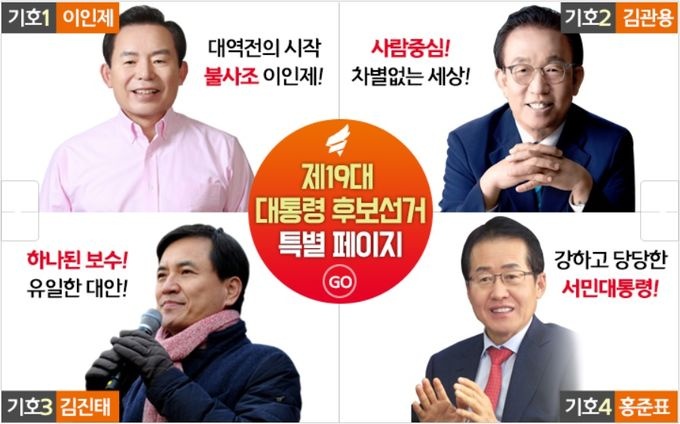자유한국당은 이인제, 김관용, 김진태, 홍준표 후보가 경쟁을 펼치고 있다. 이 중 홍준표 후보는 잘 알려진 대로 경남지사에 당선된 뒤 진주의료원 폐업을 주도한 인물이다.