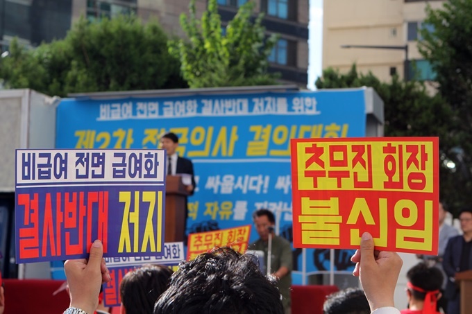 김승진 비급여 비상회의 공동의장은 "전국민 건강보험이 시행되고, 의악법이 시행되고, 이어 비급여의 국가통제가 시작된다"며 "더 이상 물러날 곳이 없음에도 현 의협 집행부는 다르게 행동하고 있다"고 집행부를 질타했다.