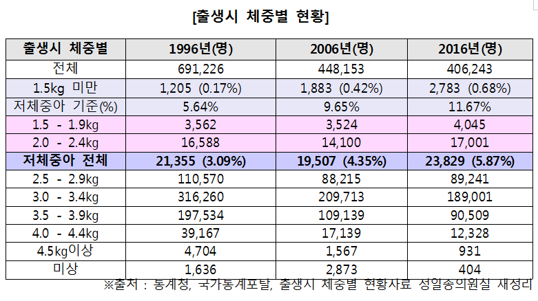 저체중아 중 극소저체중아가 차지하는 비중 또한 1996년 5.64%에서 2016년 11.67%로 2배 늘어났다.