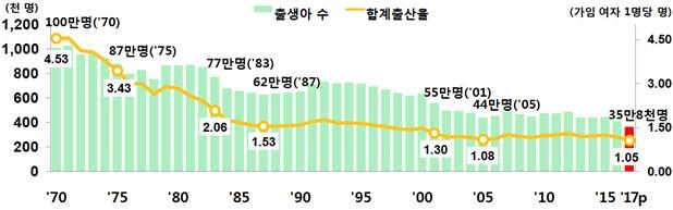이는 관련 통계를 생산하기 시작한 1970년 이래 최저치다. 출생아 수는 2002년 49만2111명으로 50만명 선이 무너진지 15년 만에 30만 명대로 내려앉았다.