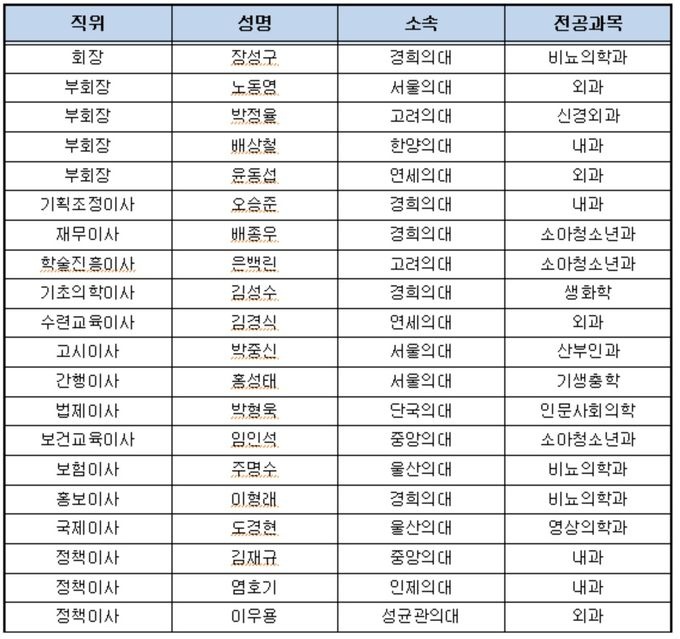 한편 이날 총회에서는 장성구 회장과 함께 회무를 이끌어 갈 임원진 인준도 이뤄졌다. 이번 제23대 집행부에는 서울뿐만 아니라 지방 소재 대학병원 교수까지 전방위적으로 포진됐다.