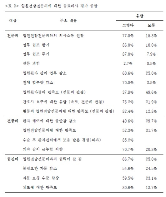다만 입원전담전문의에 대한 주변 의료인들의 반응은 긍정적이었다. 의사소통 및 치료계획 공유 등 실질적 개선이 이뤄졌다는 평가도 나왔다.