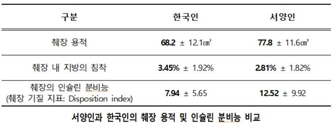 하지만 췌장의 용적을 비교한 결과 한국인이 서양인에 비해 췌장의 크기가 12.3% 정도 작았으며, 오히려 췌장 내 침착된 지방의 양은 서양인에 비해 22.8% 더 많은 것으로 확인됐다.