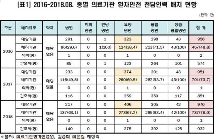 올해 8월 기준 전체 970대 대상기관 중 환자안전 전담인력이 배치돼 있는 곳은 737곳(76%)으로, 이중 요양병원은 지난해 69.5% 수준에 비해 2.3% 감소한 67.2% 배치에 그쳤다.