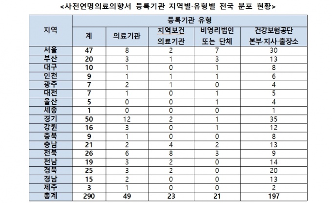 전국 총 290개소의 사전연명의료의향서 등록기관<붙임2>에서 국민 누구나 평소 연명의료에 관한 의사를 미리 밝혀둘 수 있도록 지정했다.
