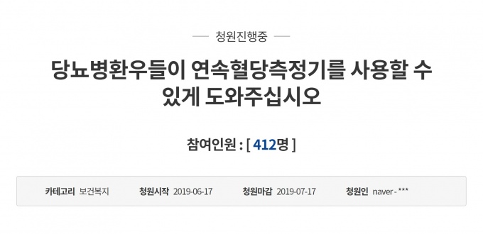 '당뇨병환우들이 연속혈당측정기를 사용할 수 있게 도와주십시오'라는 제목의 청원은 6월 17일 시작돼 7월 17일까지 진행된다. 6월 24일 오후 2시까지 공감한 청원인은 총 412명이다.