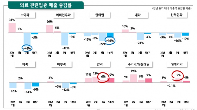 [데일리메디 백성주 기자] 코로나19 여파로 대다수 병·의원 매출이 직격탄을 맞은 가운데 오히려 안과, 성형외과 등과 약국의 매출은 늘어난 것으로 나타났다.